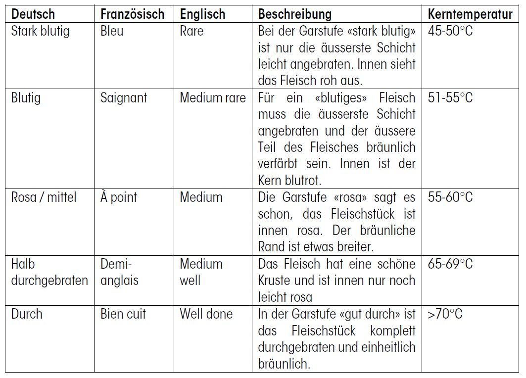 In unserem Sprachraum sind für die Garstufen von Fleisch drei Sprachen gebräuchlich: Englisch, Französisch und Deutsch.