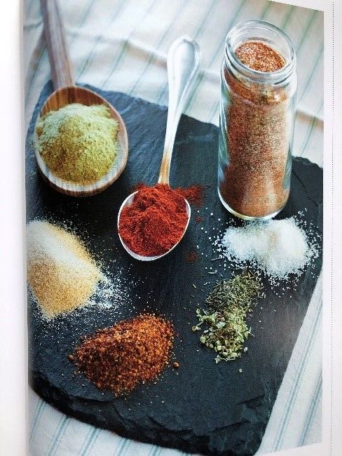 200 g sel, 25 g paprika en poudre, 5 g poivre, 20 g poudre d’ail, 10 g romarin en poudre, 10 g thym séché, 10 g origan séché