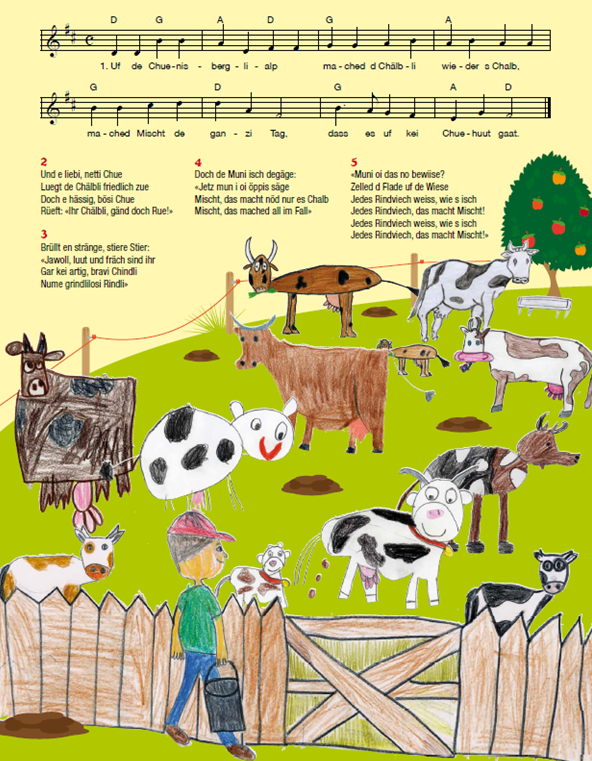 Pour écouter la chanson et fredonner la mélodie, c’est par ici. La chanson est pleine de jeux de mots en dialecte suisse-allemand, ce qu’il n’est pas toujours possible de traduire. Mais voici quand même le contenu de la chanson en français, histoire que vous puissiez suivre la discussion entre les membres du troupeau :
